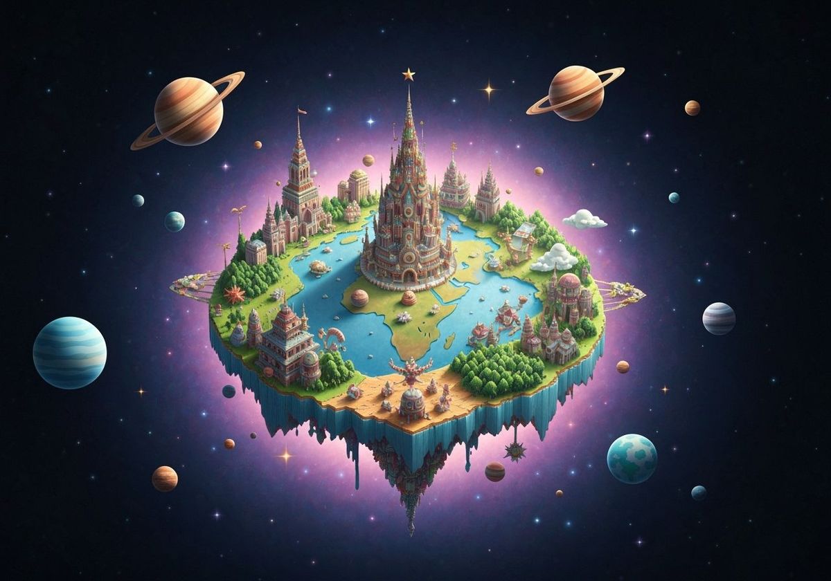 This image shows a detailed depiction of a flat Earth at the center of the universe. Fantastical creatures and architecture populate intricate landmasses, with stars and planets circling above in a vibrant, colorful, papercraft aesthetic.