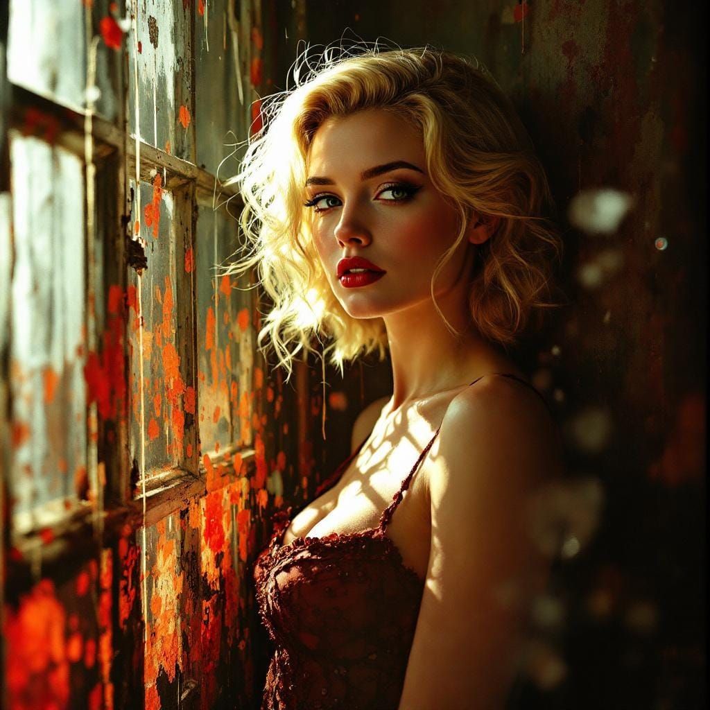 A vivid image of a blonde woman evoking 1950s pin-up style, set against an urban backdrop. The artwork blends atmospheric depth with color layering for a nostalgic effect.