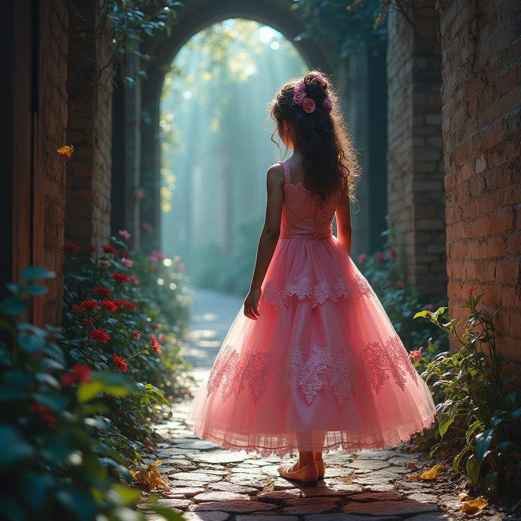 A vivid picture of a girl in a pink dress stepping through a portal. The portal leads away from a dark alley and into a vibrant, dreamlike Alice in Wonderland-inspired aesthetic.