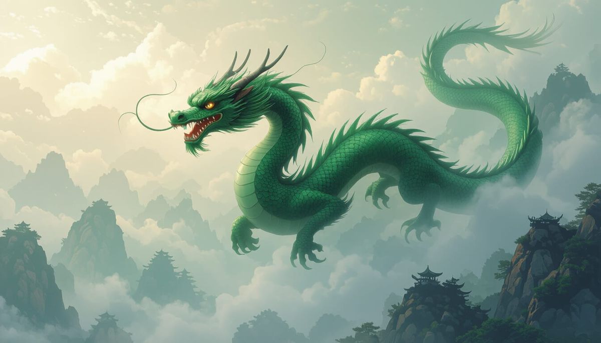 This image shows a vivid green Chinese dragon in flight. The dragon's body is mostly straight, set against a misty, ethereal fantasy background. The artwork is highly detailed.