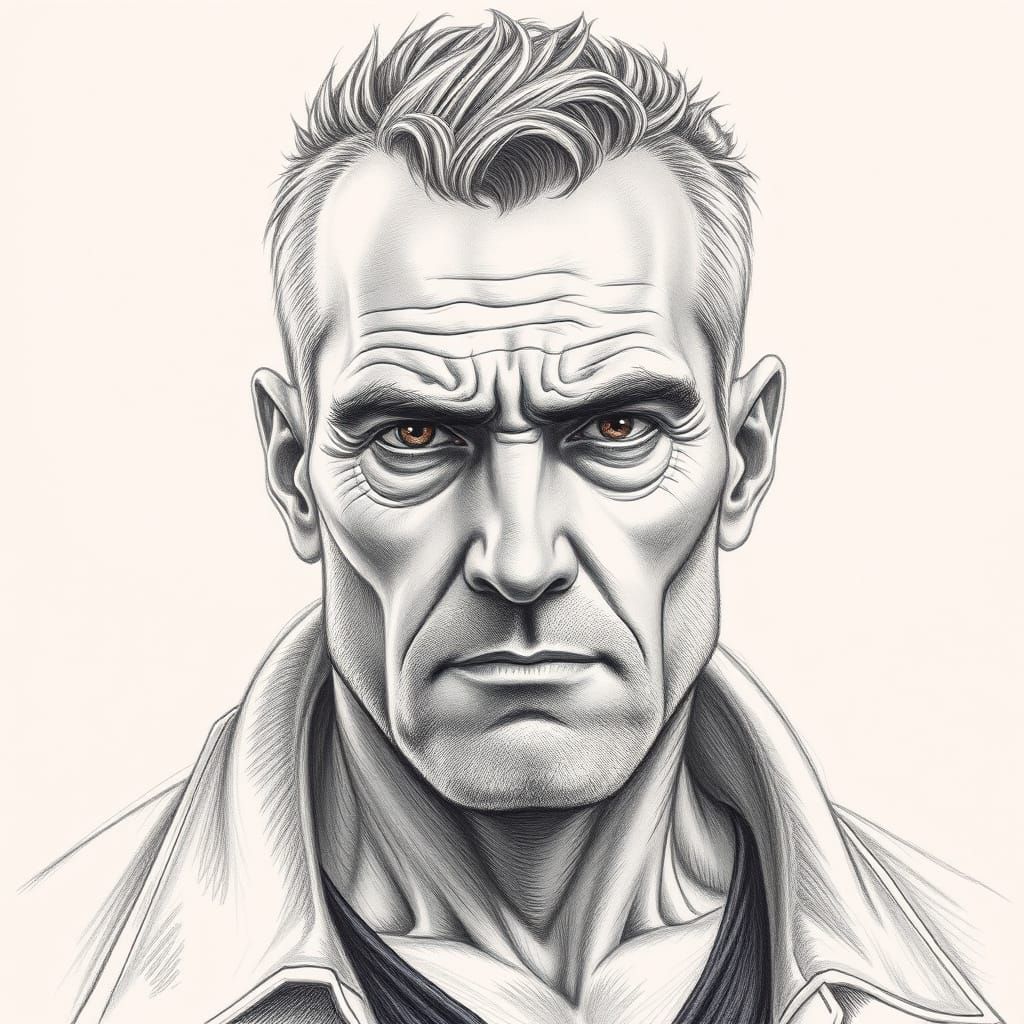 This image is a highly detailed, realistic pencil drawing of a middle-aged man with a serious expression, chiseled features, and deep wrinkles, rendered in a classical art style reminiscent of Renaissance portraiture with soft textures and delicate lines.