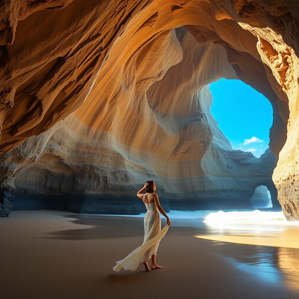 This image shows a woman in white on a beach inside a vast sea cave. Wind and rain have shaped the cave into a dome with an eye-shaped opening to the sky, in a dreamy, vibrant style.