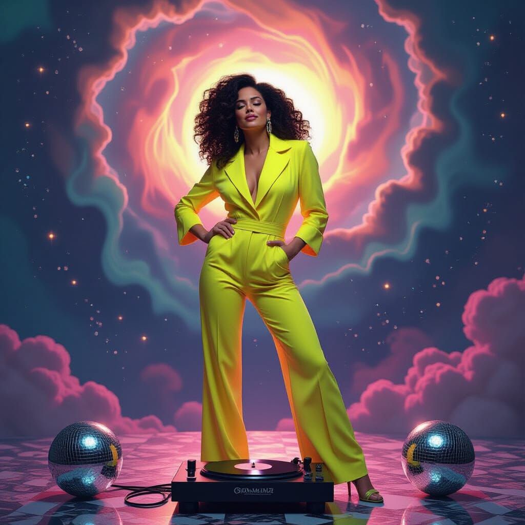 This image shows a woman in a neon jumpsuit in an afrofuturist cosmos. Swirling nebula gases and acid jazz-inspired cartoonish comics surround her in a vibrant, photorealistic, and ornate aesthetic.