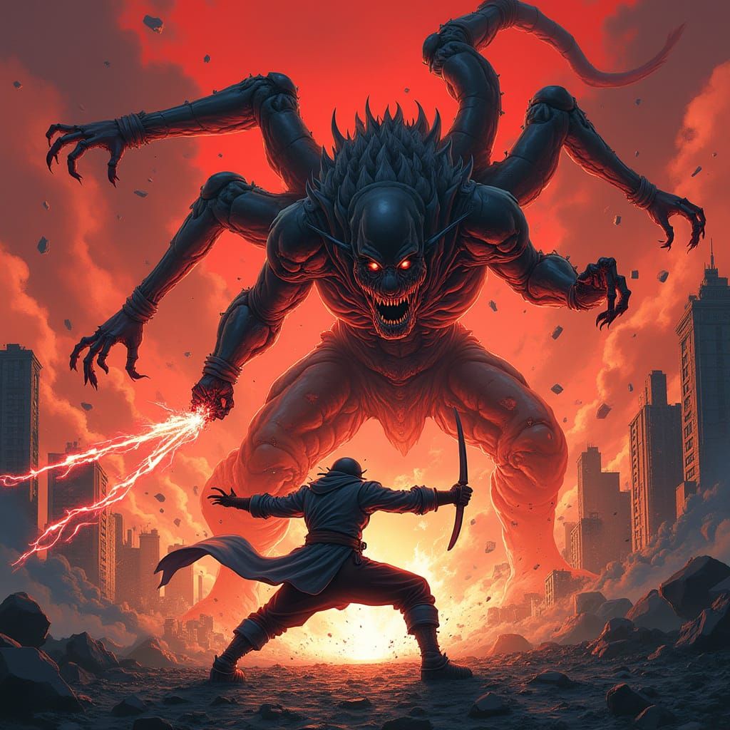 This image depicts a fierce warrior battling a monstrous alien in a destroyed city. Explosions and speed lines highlight the intense, dynamic action in a vibrant, epic mecha anime style.