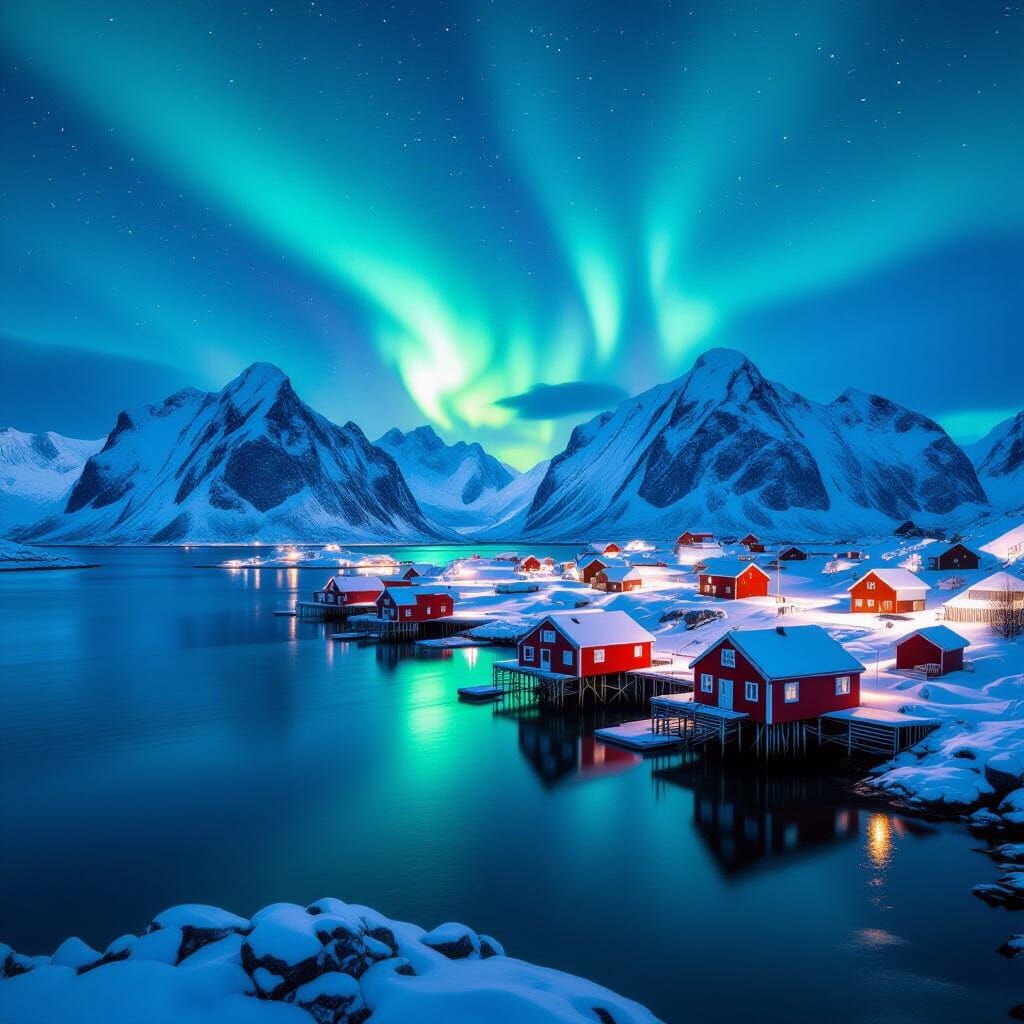 This image shows the picturesque Reine village in Norway's Lofoten Islands. Red and white cabins stand on stilts over the water, set against snow-capped mountains and the aurora borealis, with cinematic lighting.