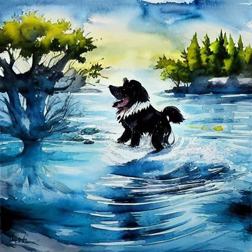This image shows a dog swimming in water. The artwork is a romantic watercolor painting with high contrast and intricate details.