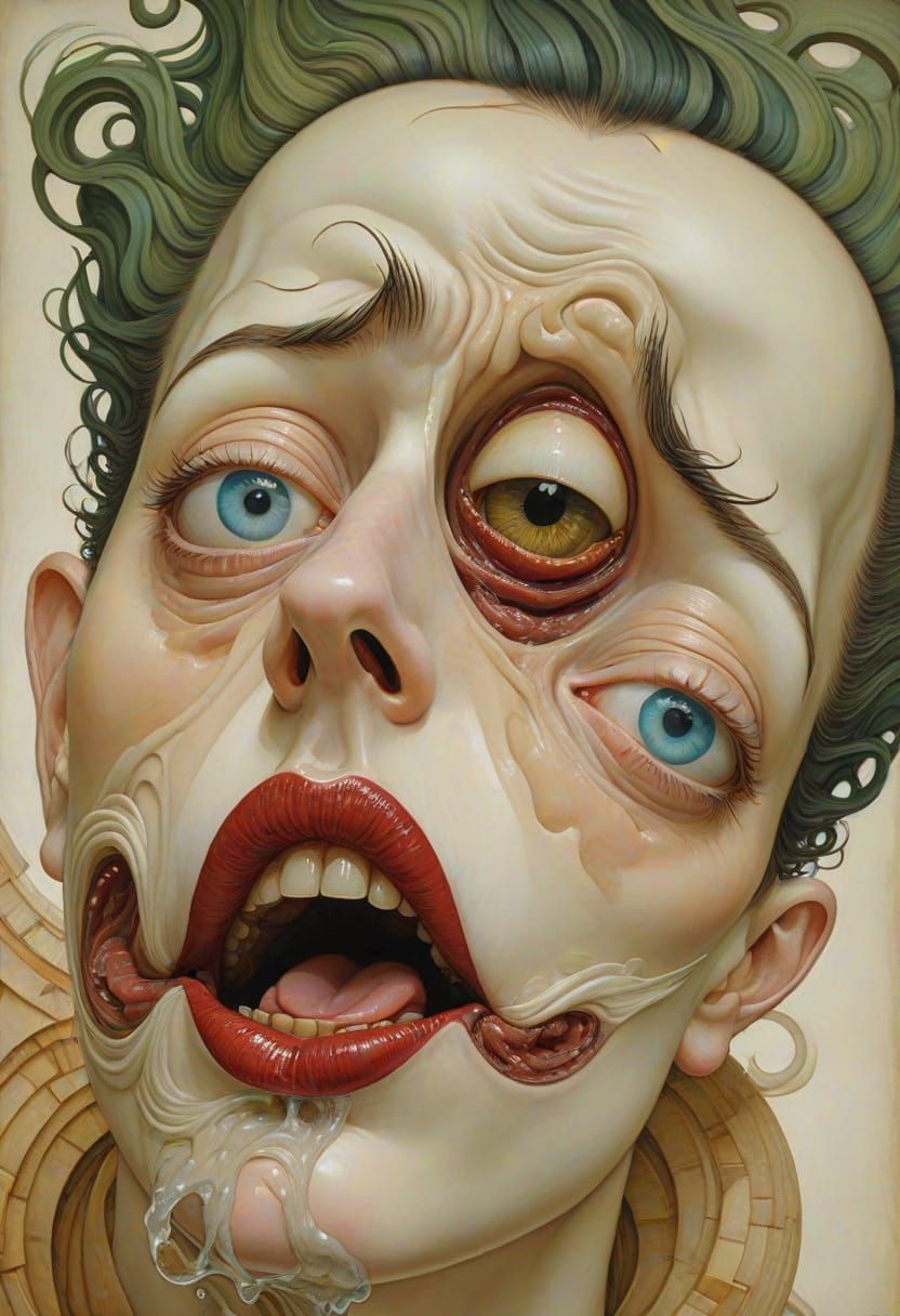 This image shows a disturbing panoramic scene featuring a tongue spiral. The artwork employs a gritty and twisted style reminiscent of expressionist and surrealist art.