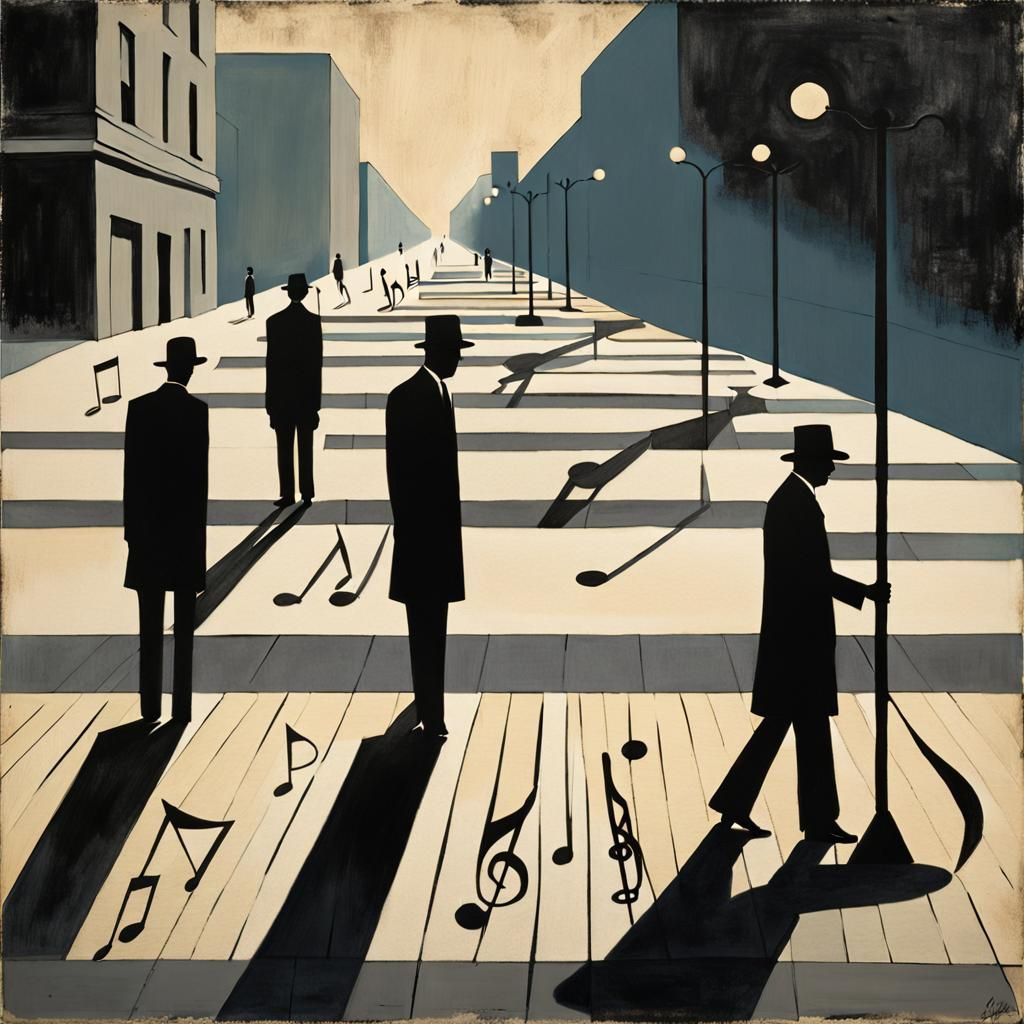 This image shows surreal figures with musical notes for heads standing on a sidewalk. The scene, in minimalist style, features shadows and muted colors creating a dreamlike atmosphere.