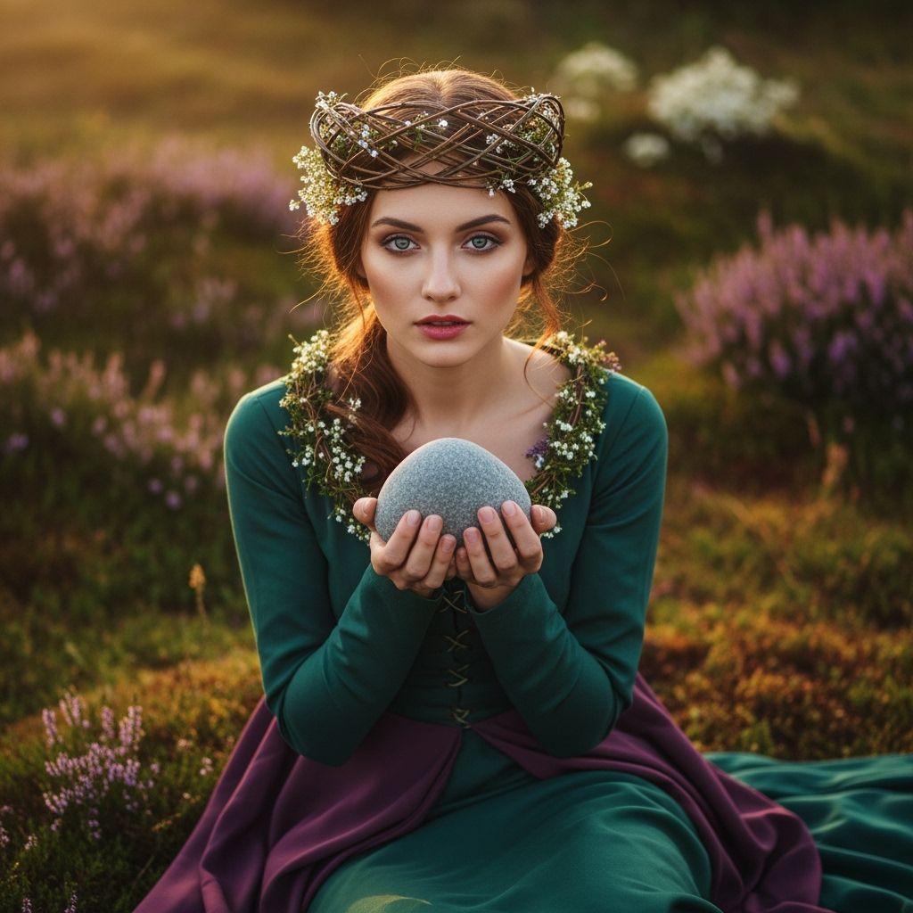 This image shows a princess sitting on a bog, holding a stone. She is illuminated by a warm glow, and wears a crown of twigs and leaves, and a gown of emerald green and deep violet.