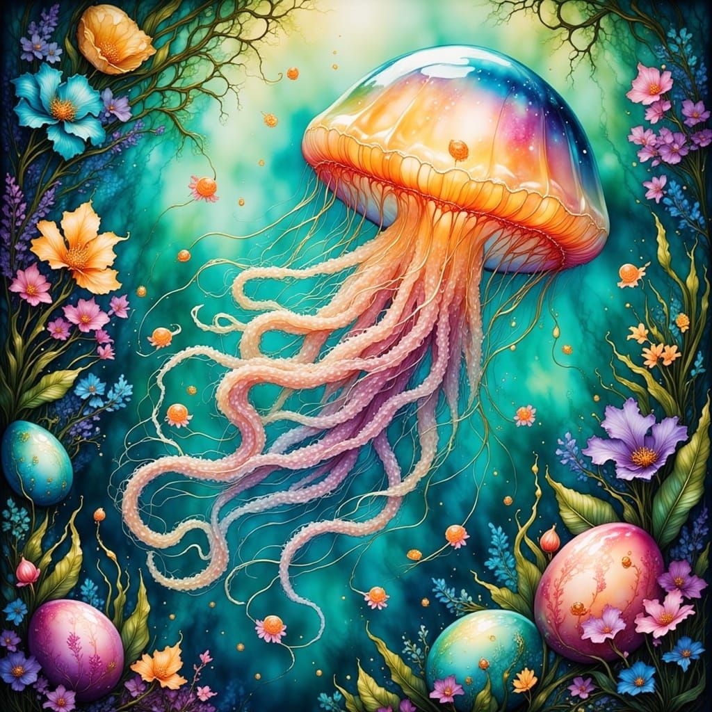 This image shows a fantastical jellyfish surrounded by Easter eggs in soft pastel hues, each egg featuring baby jellyfish, in a serene underwater garden with swaying sea fans and lush greens.