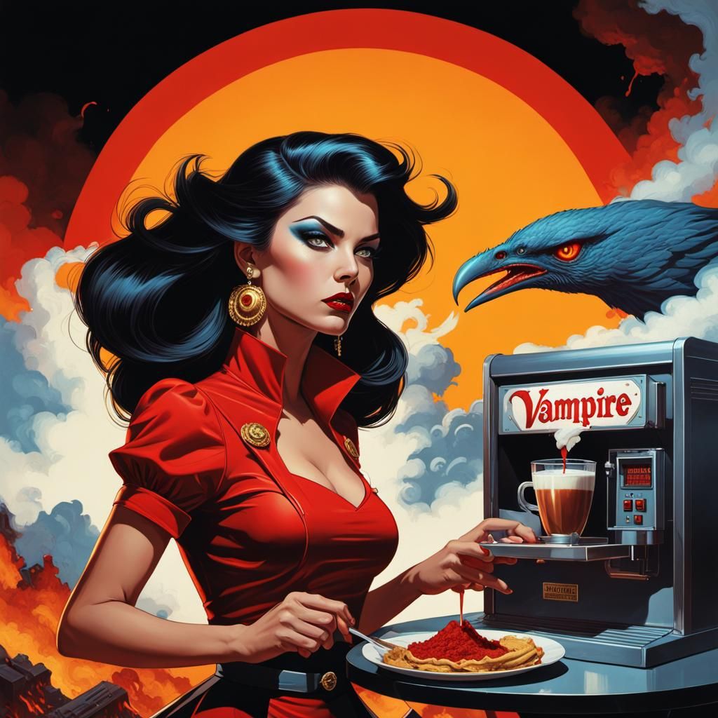 A striking picture of a beautiful vampire woman in a retro comic book style. She feeds a machine amidst smoke, lava, and a strange bird, rendered with dynamic lighting and intricate detail.