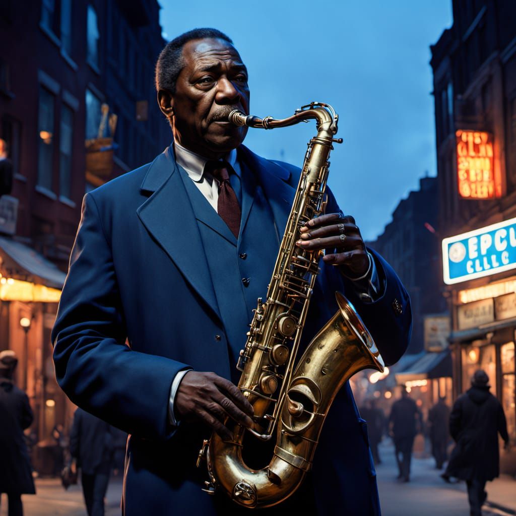 A striking picture of a musician at twilight in Greenwich Village. The composition uses film noir elements, azure tones, and high contrast chiaroscuro to create a moody, vintage atmosphere.