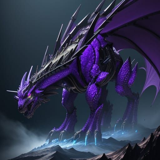 A detailed digital painting of a black and purple dragon with gold horns and glowing eyes, standing on a mountain with a cinematic sci-fi background. Features polished metal and dramatic lighting.