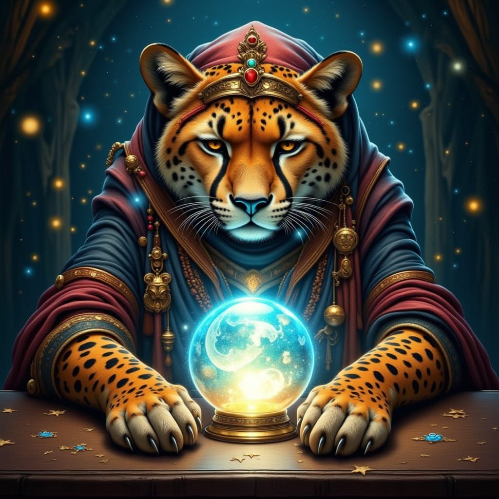 This image shows a majestic cheetah in ornate mystical robes, its paws resting on a table with a glowing crystal ball. The scene is rendered with dramatic lighting and vivid, jewel-toned colors.