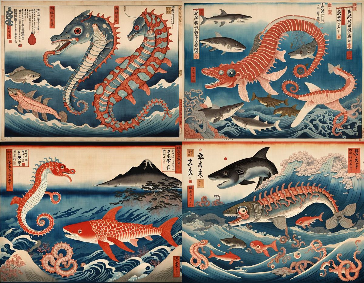 A bizarre Ukiyo-e style image showing an underwater seahorse homunculus hybrid. It features a disturbing combination of anatomical elements in a surreal composition.