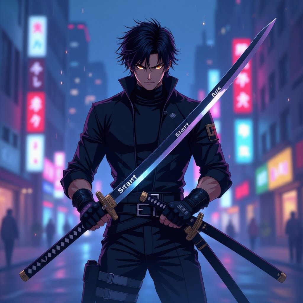 A dynamic anime character in black clothing holds two long swords with English inscriptions, set against a dazzling neon-lit cityscape. The artwork features a modern anime aesthetic.
