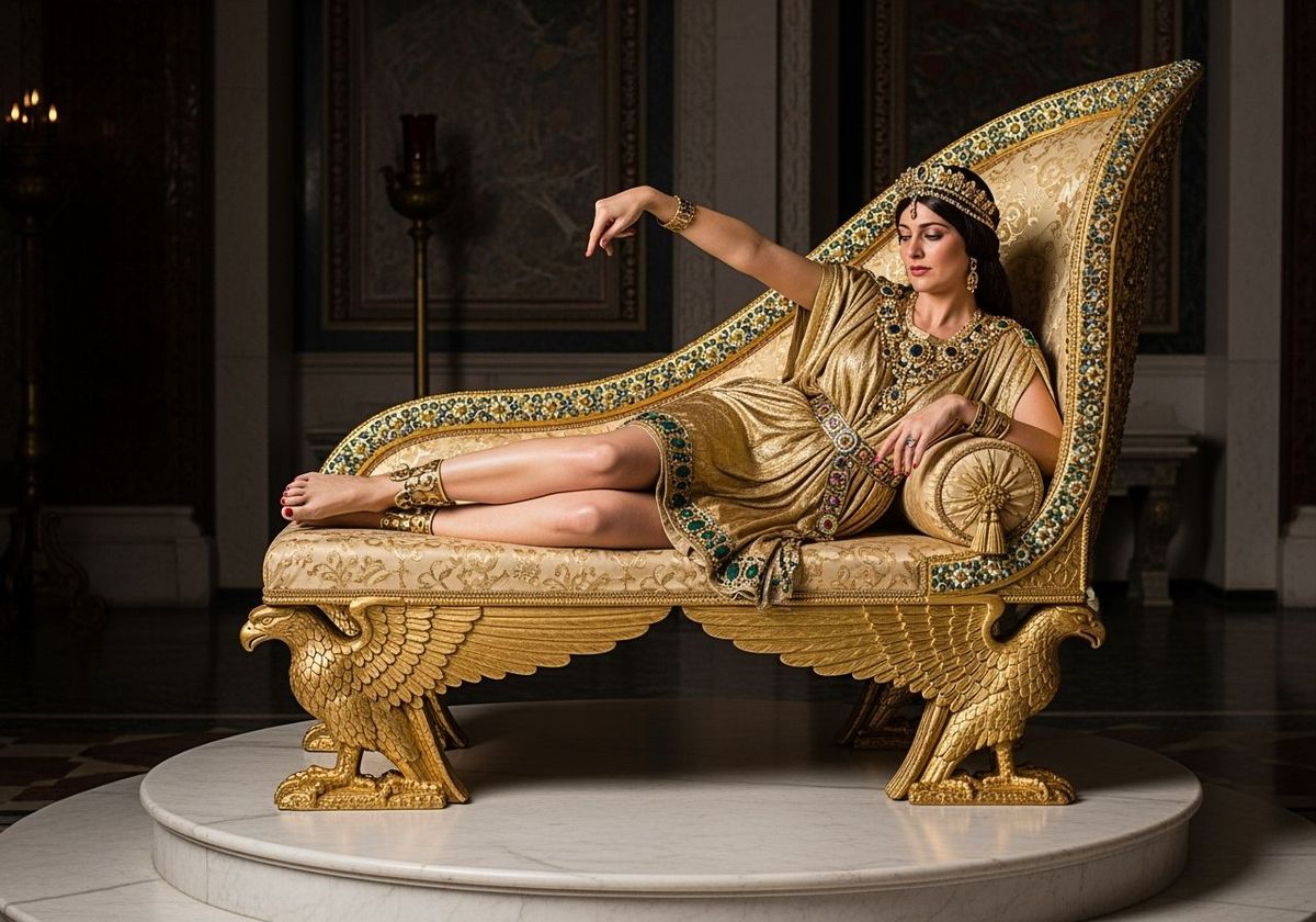 A photograph of Empress Theodora reclining on an ornate chaise lounge in a throne room. She wears a gold toga and tiara, with gold jewelry and red toenails. The image uses natural light and a shallow depth of field.
