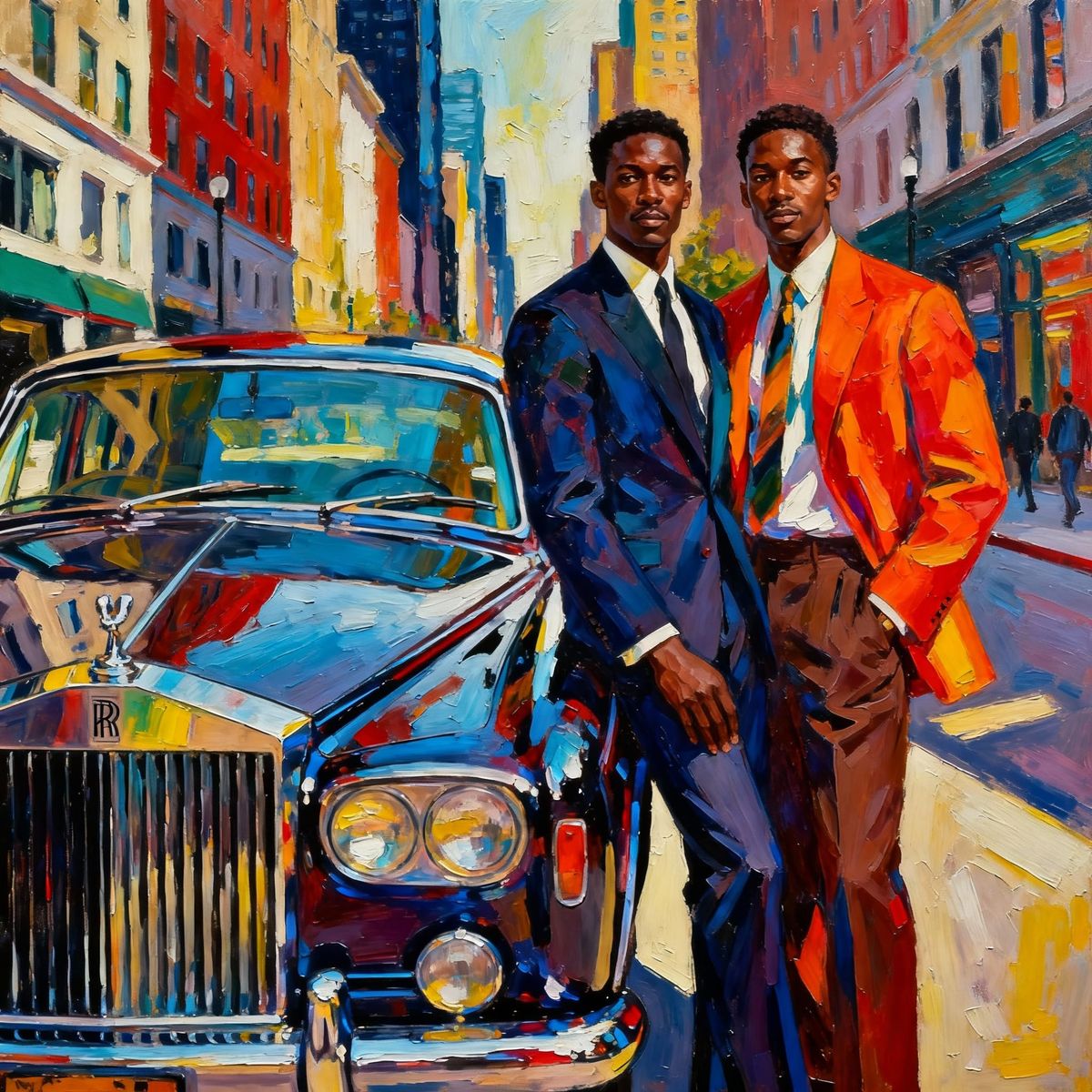This impasto oil painting captures a stylish African American couple beside a vintage Rolls-Royce on a bright NYC street, featuring bold brushstrokes and dramatic lighting.