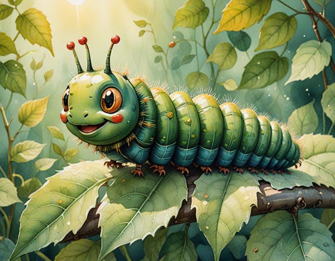 A watercolor-style illustration of a cheerful caterpillar on a leaf, bathed in warm sunlight. This charming image evokes a sense of nostalgia, reminiscent of vintage children's book art.