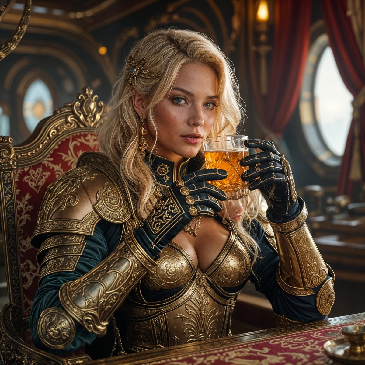 This image shows a space pirate captain relaxing in her quarters. She has golden hair, wears medieval armor, and sips a drink, all in a rococowave aesthetic with volumetric lighting.