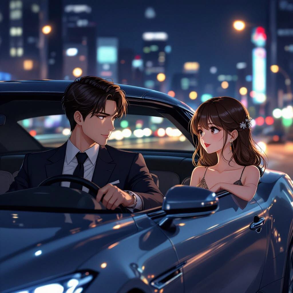 This image shows a man and a woman in a car at night, sharing a quiet moment. The scene is rendered in a detailed 3D anime style with romantic lighting, evoking a sense of unspoken tension.