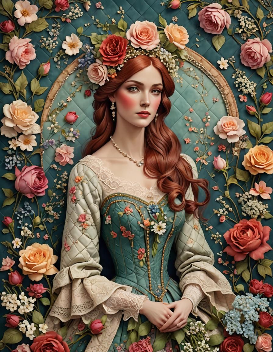 A digital matte painting of a beautiful woman with auburn hair surrounded by spring flowers, lace, and pearls. The image features a quilted patchwork paper effect and complementary colors.
