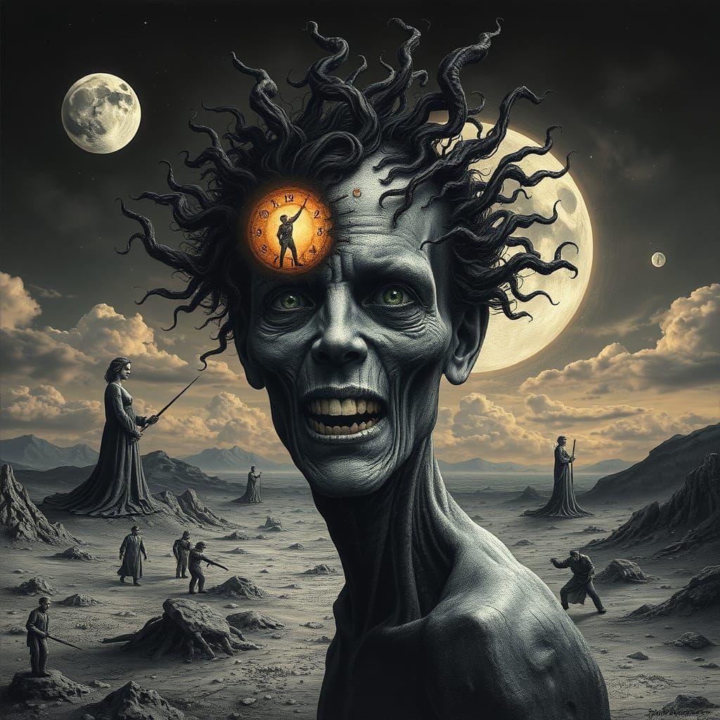 This surrealist artwork depicts a bizarre and unsettling scene, exploring the theme of a lunatic within the mind. The image evokes a sense of strangeness and psychological depth.