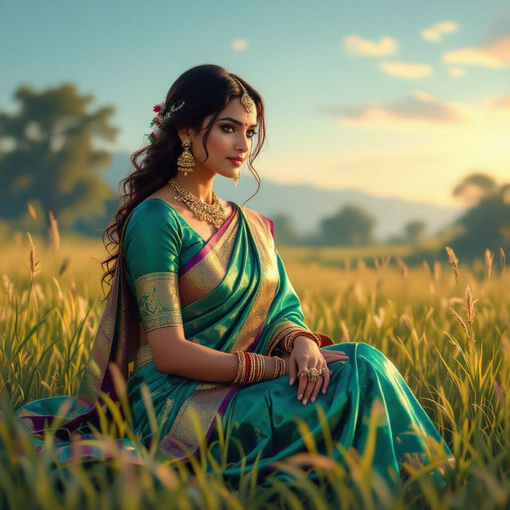 This image shows a beautiful Indian woman in a vibrant silk saree sitting in a tranquil village field at dawn. It features a deep color palette and soft golden light, rendered in a fantasy concept art style.