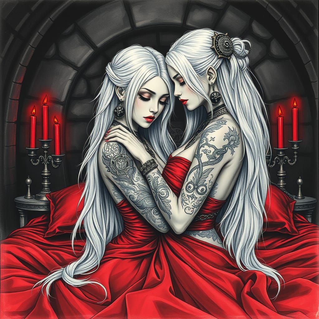 This image shows two Thai women embracing in a dimly lit, gothic bedroom with intricate details in a charcoal drawing style reminiscent of hyper-realistic art.