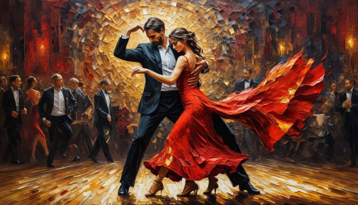 abstract realism painting of Long shot :: an intimate moment between a man and a woman engaged in a passionate tango dance. The man, dressed in a classic black suit, elegantly supports the woman adorned in a striking red dress, which flares dramatically as they move. Set against a background, the artwork ...