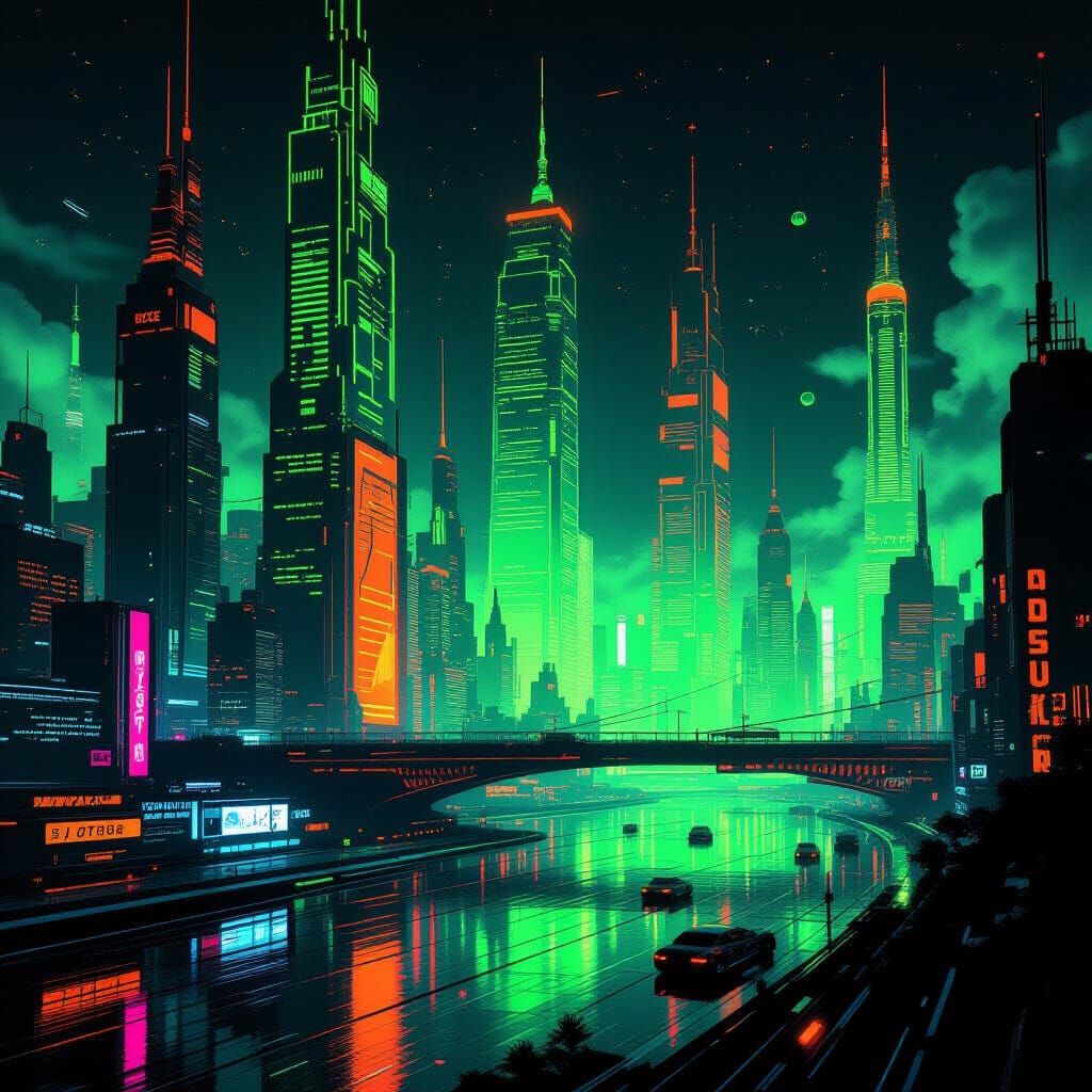 A striking picture of a futuristic cityscape bathed in neon green and orange. The high-contrast scene evokes a retro-futuristic aesthetic with dark backgrounds.