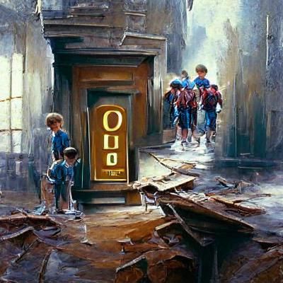 A digital oil painting of a boy entering a building. The building's sign transforms from 'ORDINARY' to 'ODDINARY' as chaos erupts. This dramatic image features rich textures.