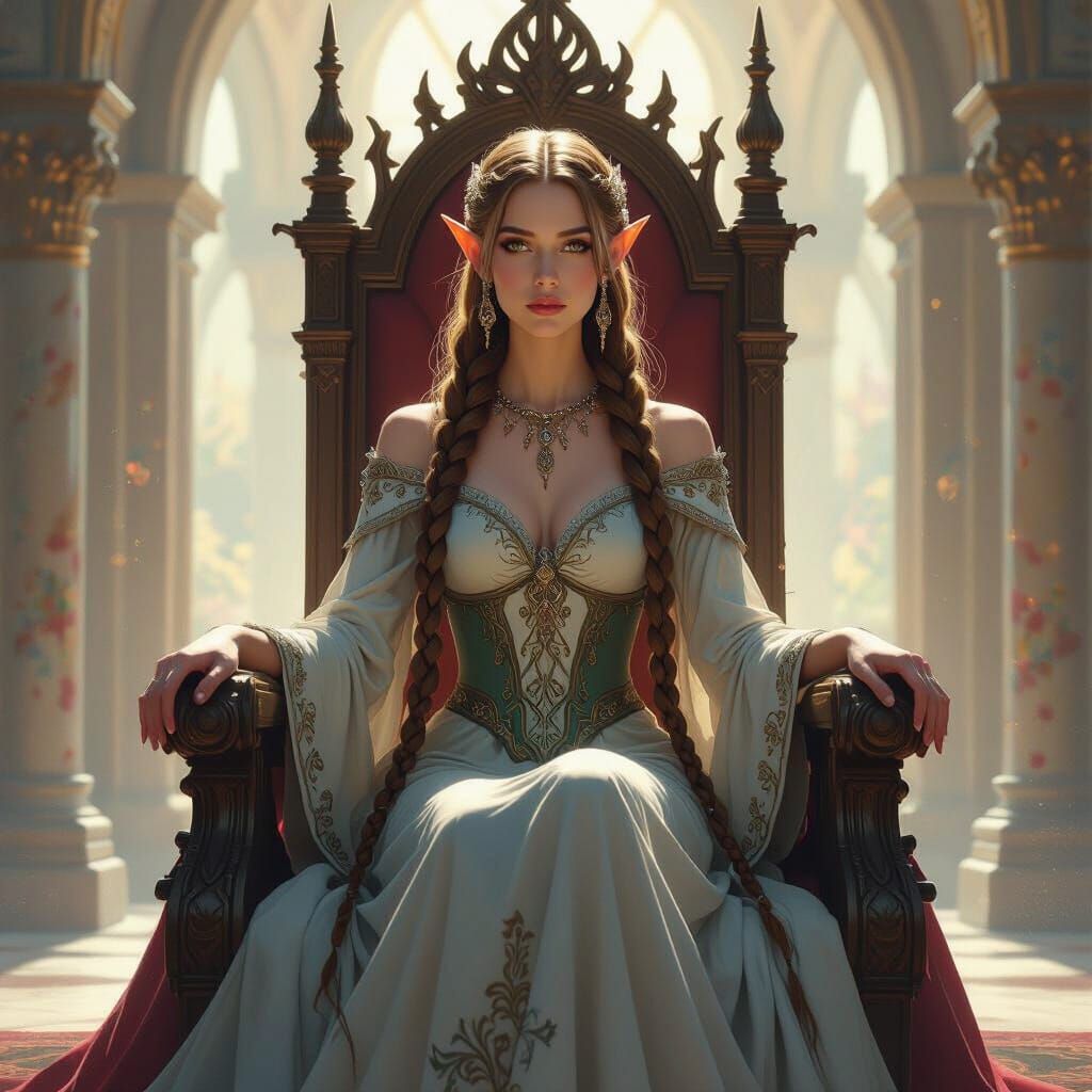 This image shows an elven queen with braided hair and an ornate gown seated on a throne. Sunlight illuminates her face in this ethereal digital painting with vibrant colors.