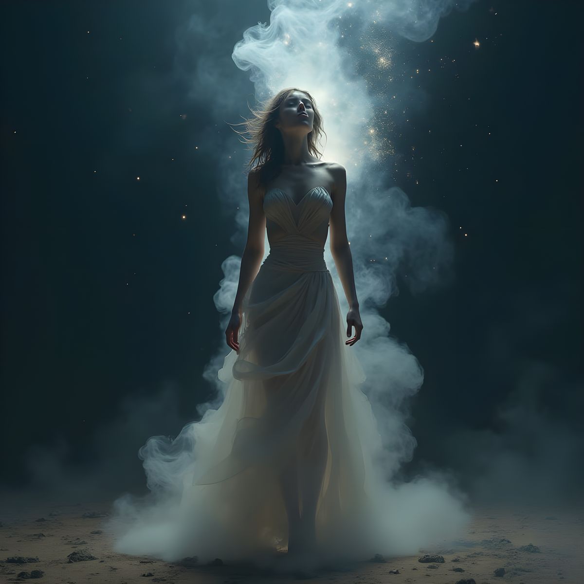 This image depicts a woman composed of swirling smoke, set against a dark, inky sky, with twinkling stars illuminating her ethereal form.