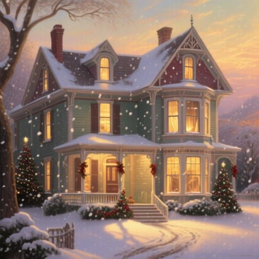 A realistic, cinematic depiction of a Victorian house decorated for Christmas, featuring warm, vintage lighting and falling snow for a nostalgic feel.