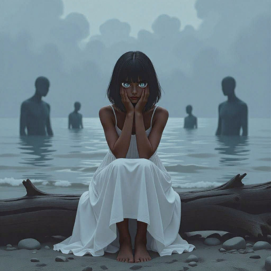 This image shows a dark-skinned girl with oversized glassy eyes sitting on a log at a rocky beach. Silhouetted figures glide across the water beneath a cloudy sky.