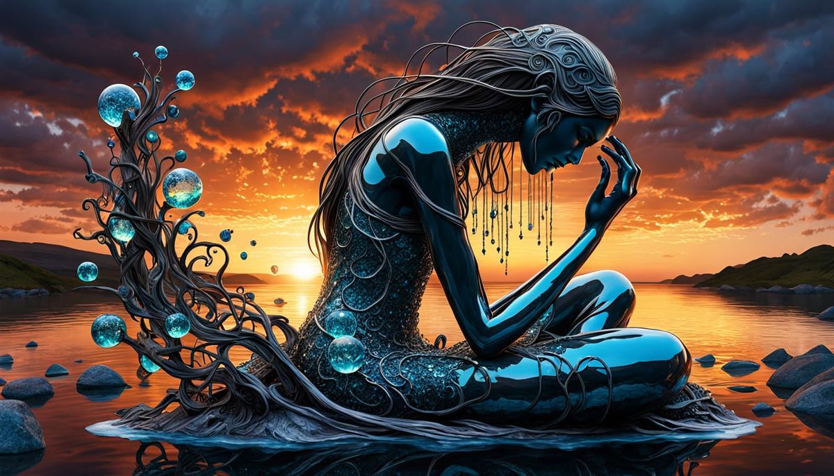 This image showcases a surreal fragmented sculpture of a woman by a sunset. The artwork incorporates bio art elements, folklore creatures, and abstract designs, symbolizing resilience and embracing change.