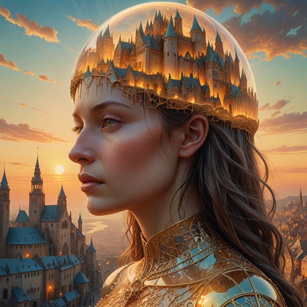 A surreal image of a medieval city contained within the transparent head of a woman. Dreamlike digital art with soft, glowing light and intricate details in pastel colors, reminiscent of golden hour.