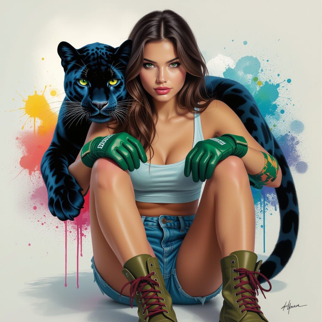 This image shows a detailed hyperrealistic splash art concept of a woman in gloves, boots, a top, and pants, posing with a panther. The scene features dramatic lighting and a colorful background.