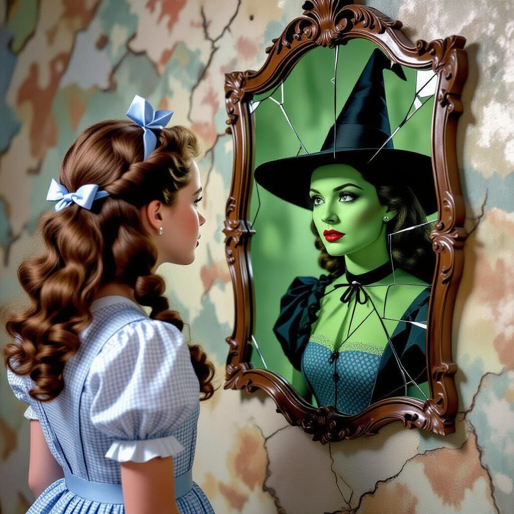 Photorealistic young Dorothy sees the Wicked Witch of the East as her distorted reflection in a cracked mirror. Captured with cinematic lighting and a wide-angle lens, this image uses cubist fragmentation and dramatic contrast.