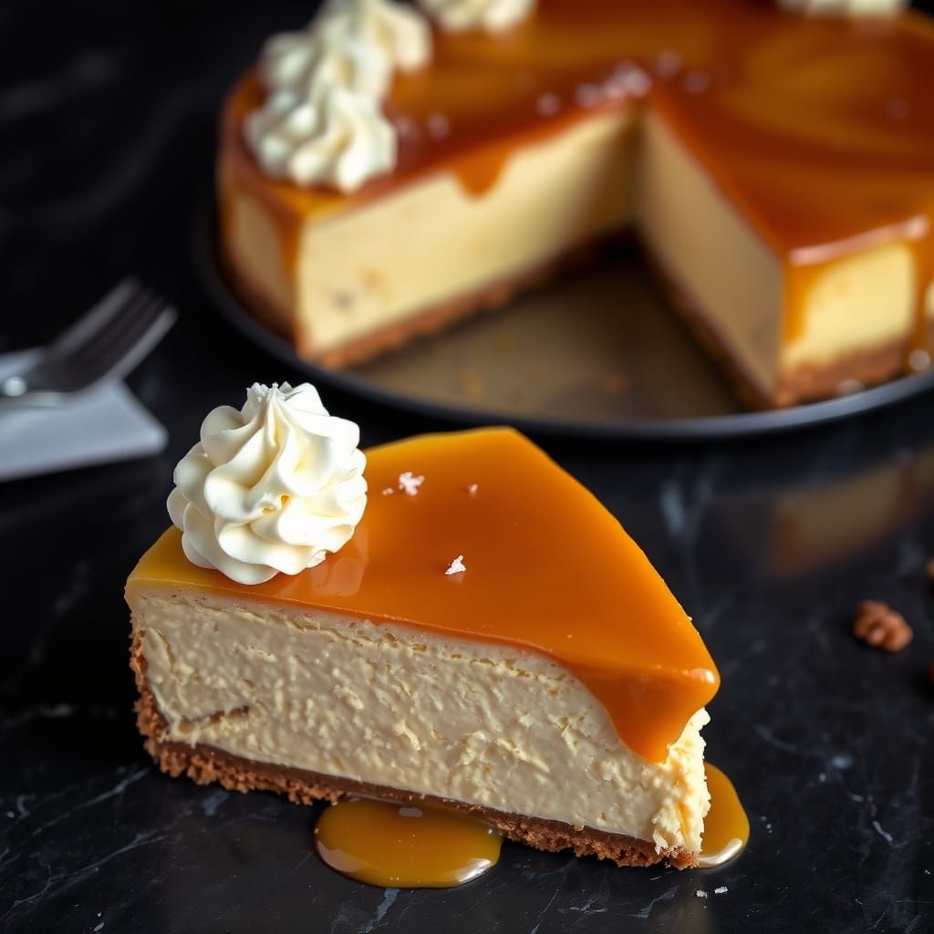 This image showcases a decadent slice of dulce de leche cheesecake with a buttery crust, smooth surface, and drizzle of caramel sauce, garnished with whipped cream, sea salt, and caramelized nuts in a warm, inviting setting.