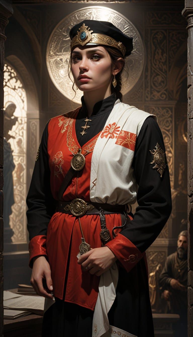A medium shot of Lilian and a neighbor at a detailed police station, depicted in Byzantine icon art style with glowing patterns and dramatic lighting.
