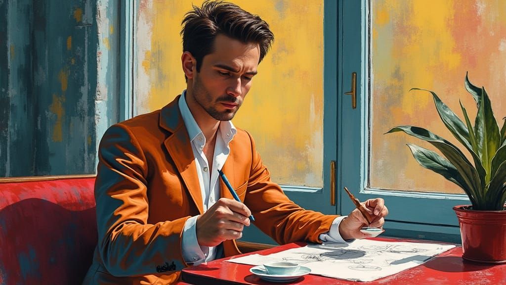 This image shows a young man in 1950s Rome, designing a sculpture in a cafe. The artwork captures a mid-century modern aesthetic with vibrant colors and sharp lines.