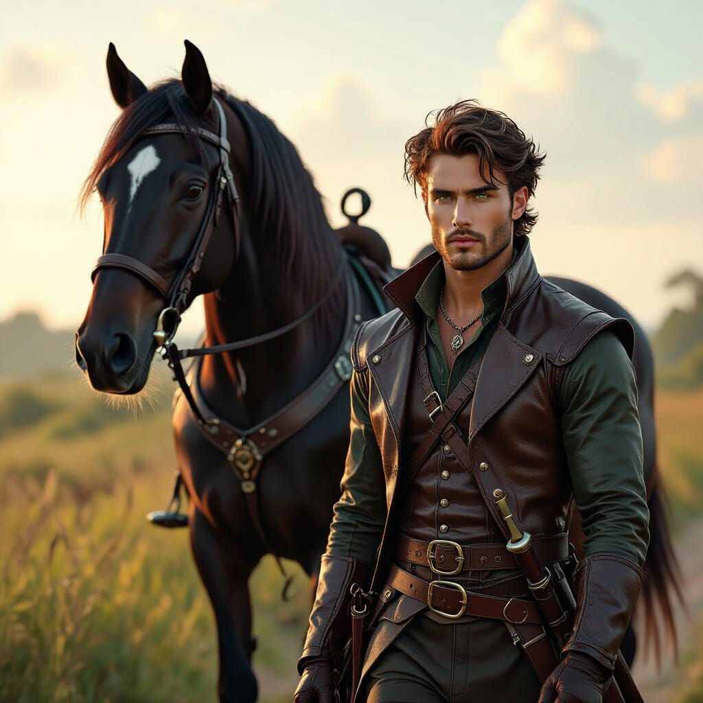 A striking picture of a muscular 23-year-old man with devilish hair and green eyes, dressed as a horse hunter, walking alongside a majestic black knight's horse in a tropical setting. The image is reminiscent of digital artwork.