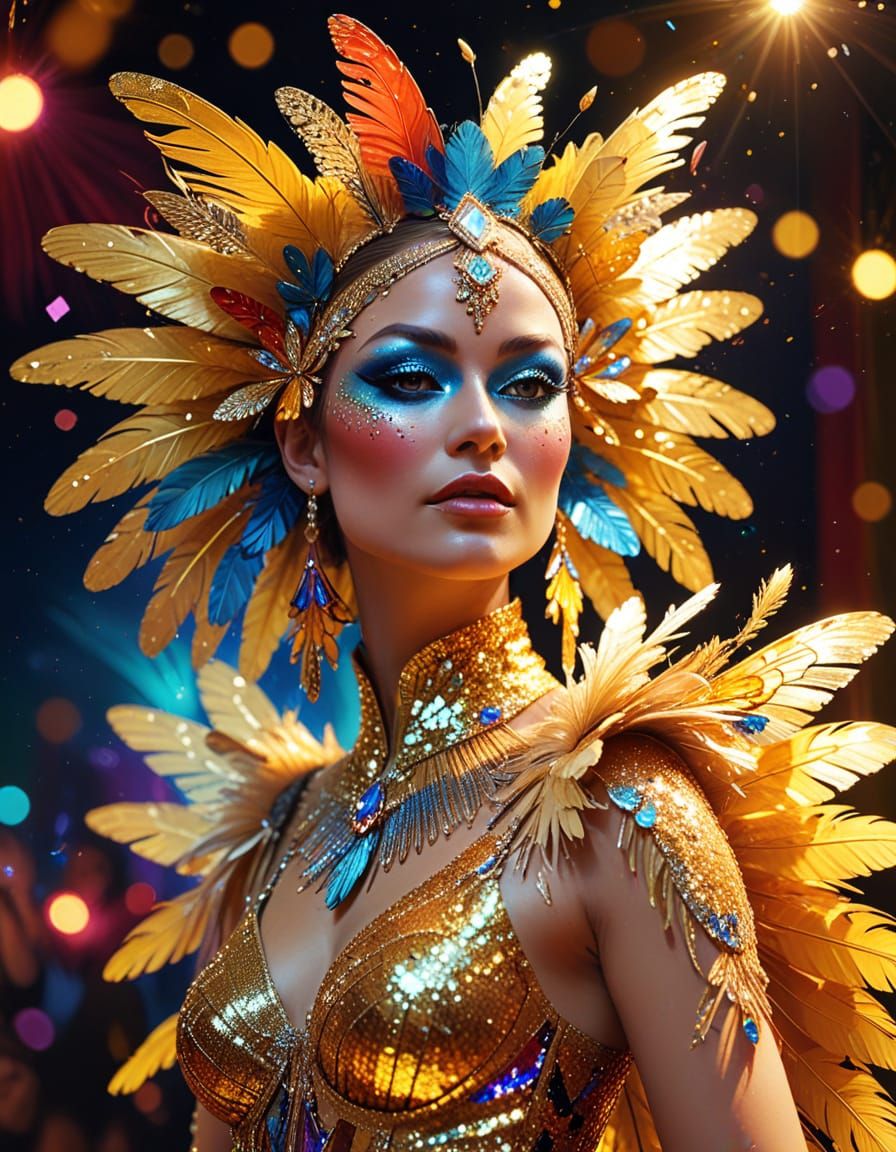 This image shows a cabaret dancer in a feathered headdress and shimmering sequins, set against bright stage lights. The vibrant oil painting style features triadic and complementary colors, enhanced with gold glitter.