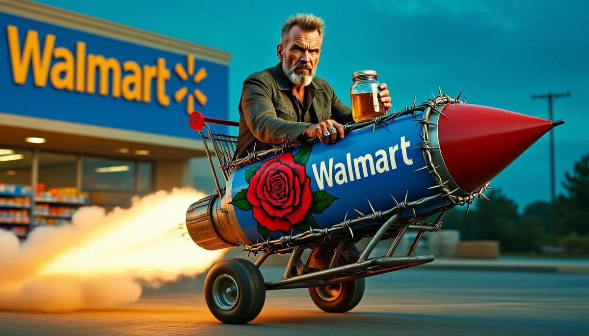 A hyperrealistic concept art piece showing Billy Bob Thornton launching from a Walmart on a barbed wire-wrapped, rocket-powered shopping cart, holding moonshine. Cinematic lighting and vibrant colors enhance the epic scene.