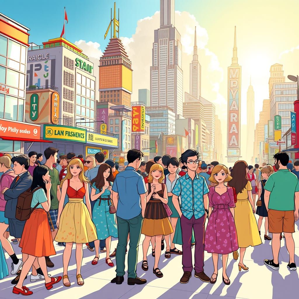 This image depicts a lively scene of people interacting in a sunlit city, characterized by whimsical and dreamy elements reminiscent of a fantastical urban landscape.