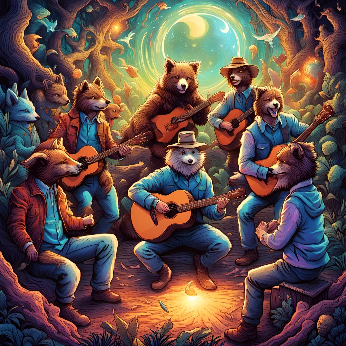 A vibrant, abstract image of a square dance featuring animals at a cottage. The scene is filled with laughter and music, rendered in complementary colors with fine details, as comic book art.