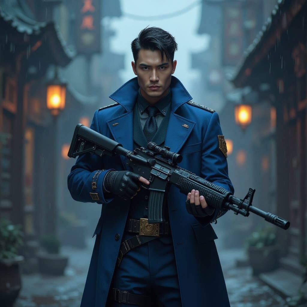 This image shows a young Asian rogue trader in blue attire holding a shotgun. The artwork features a grim, gothic atmosphere with photorealistic rendering and dramatic lighting, in a dark sci-fi style.