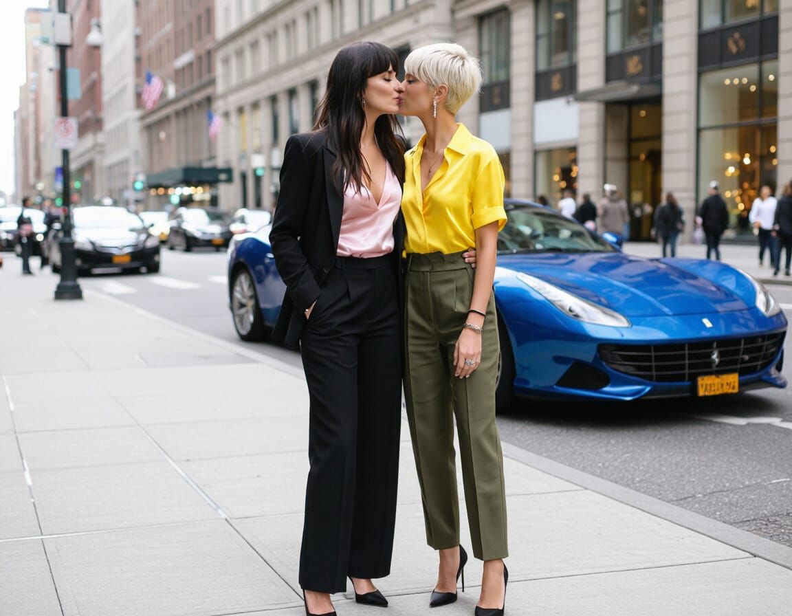 This image shows two women embracing passionately on a city sidewalk. One woman has dark hair and wears a pink top and blazer, while the other has short white hair and a revealing yellow shirt, standing by a blue Ferrari.